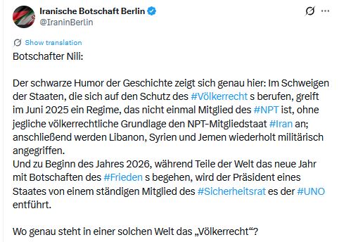 Der schwarze Humor der Geschichte zeigt sich genau hier: Im Schweigen der Staaten, die sich auf den Schutz des Völkerrechts berufen, greift im Juni 2025 ein Regime, das nicht einmal Mitglied des NPT ist, ohne jegliche völkerrechtliche Grundlage den NPT-Mitgliedstaat Iran an; anschließend werden Libanon, Syrien und Jemen wiederholt militärisch angegriffen. Und zu Beginn des Jahres 2026, während Teile der Welt das neue Jahr mit Botschaften des Friedens begehen, wird der Präsident eines Staates von einem ständigen Mitglied des Sicherheitsrat es der UNO entführt. Wo genau steht in einer solchen Welt das „Völkerrecht“?