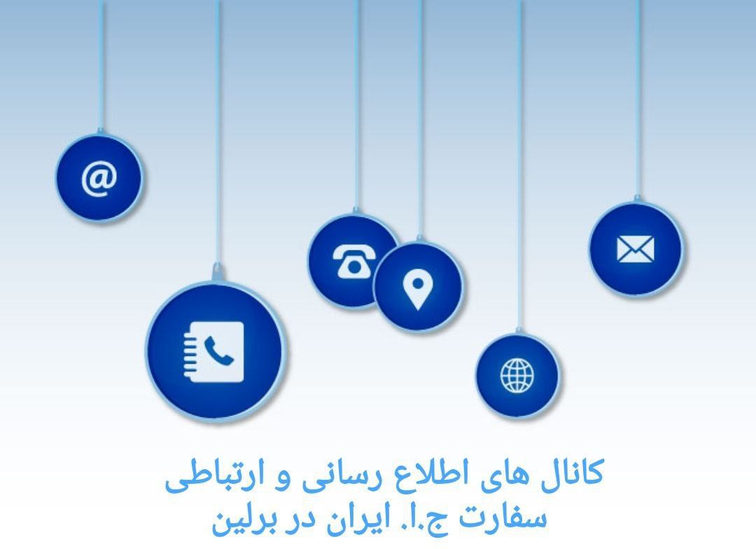 برای اطلاع از آخرین اخبار، اطلاعات کنسولی و ارتباط با سفارت ایران در برلین، میتوانید از طریق کانالهای ارتباطی (وب سایت، تلگرام، اینستاگرام و ایکس) ما را دنبال کنید.