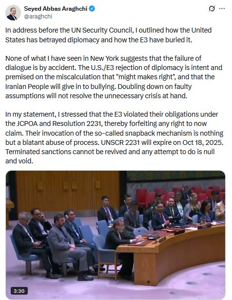 در سخنرانی دیروز در برابر شورای امنیت سازمان ملل، تشریح کردم که چگونه ایالات متحده به دیپلماسی خیانت کرد، و چگونه سه کشور اروپایی آن را به خاک سپردند. همه آنچه که در نیویورک گذشت، گواهی میدهد که شکست گفتوگوها اتفاقی نبوده است. رد دیپلماسی از سوی آمریکا و سه کشور اروپایی اقدامی عمدی بود که بر این اشتباه محاسبه استوار شده است: «حق با زورگویان است» و مردم ایران زیر فشار زورگوییها تسلیم خواهند شد! اصرار بر این فرضیات نادرست، بحران غیرضروری فعلی را حل نخواهد کرد. در سخنان دیروز خود تأکید کردم که سه کشور اروپایی به تعهداتشان طبق برنامه جامع اقدام مشترک (برجام) و قطعنامه ۲۲۳۱ شورای امنیت سازمان ملل عمل نکردهاند و بنابراین هیچ حقی برای ادعای کنونی خود ندارند. استناد آنها به سازوکار موسوم به «اسنپبک» جز سوءاستفاده آشکار از روندهای قانونی نیست. قطعنامه ۲۲۳۱ شورای امنیت در تاریخ ۱۸ اکتبر ۲۰۲۵ منقضی خواهد شد. تحریمهای لغو شده نمیتوانند دوباره اعمال شوند و هرگونه تلاش برای این کار باطل و بیاعتبار است.