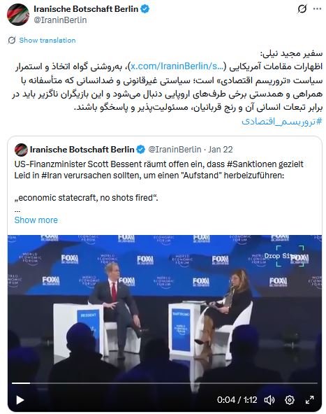اظهارات مقامات آمریکایی به‌روشنی گواه اتخاذ و استمرار سیاست «تروریسم اقتصادی» است؛ سیاستی غیرقانونی و ضدانسانی که متأسفانه با همراهی و همدستی برخی طرف‌های اروپایی دنبال می‌شود و این بازیگران ناگزیر باید در برابر تبعات انسانی آن و رنج قربانیان، مسئولیت‌پذیر و پاسخگو باشند.